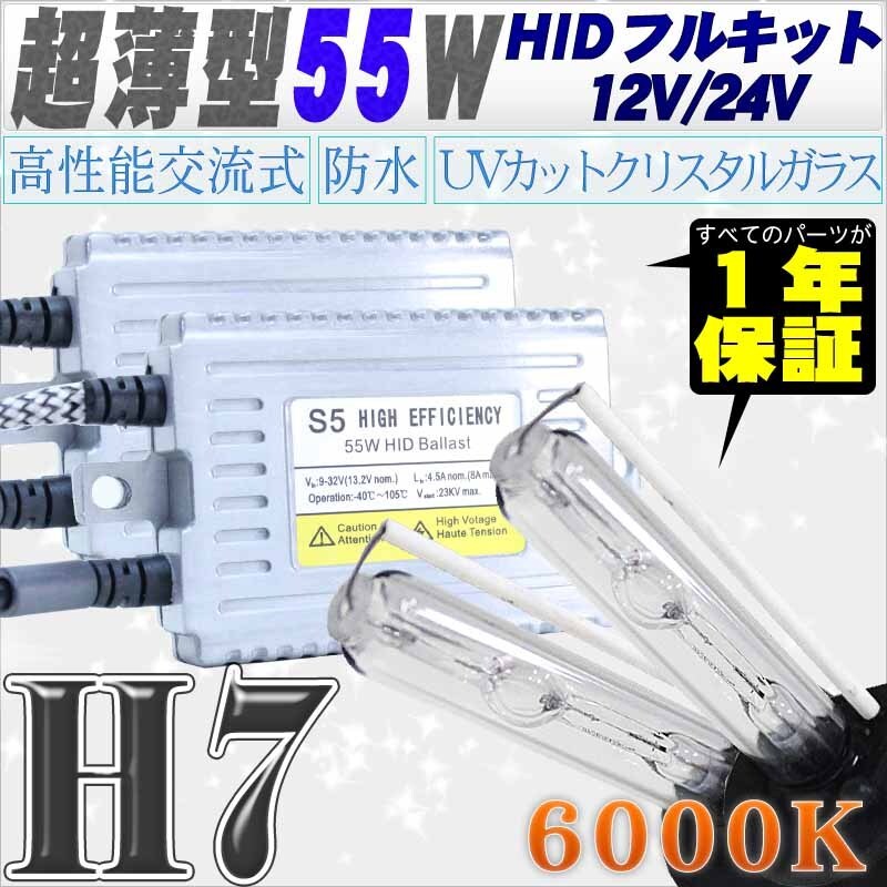- 高性能 薄型HIDキット 55W H7 リレー付 6000K 12V/24V 【交流式バラスト&クリスタルガラスバーナー】