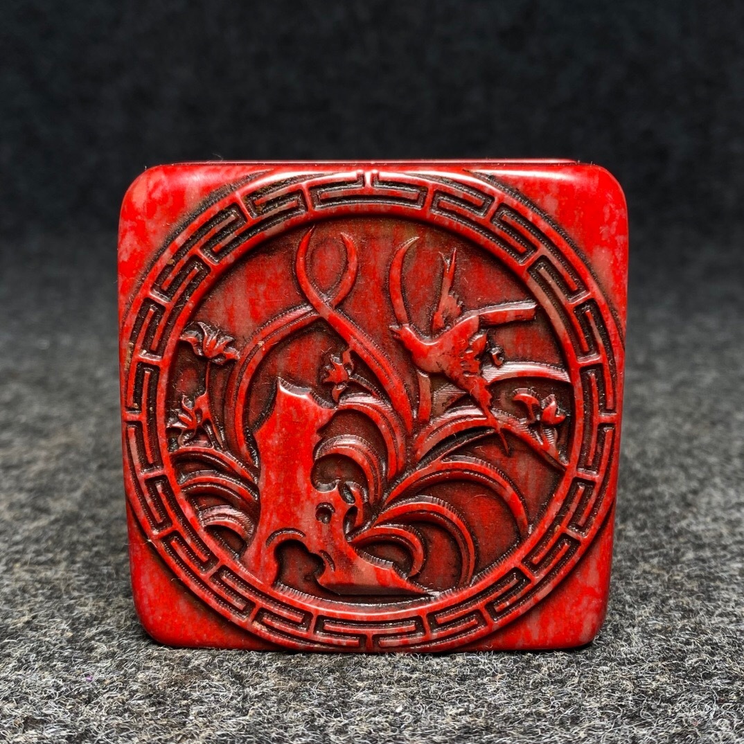 - 蔵友旧蔵出 寿山石 鶏血石 細密彫 花鳥図 印章 盒付 文房具 文案置物 書道品 稀少物品 置物 賞物 中国時代美術品