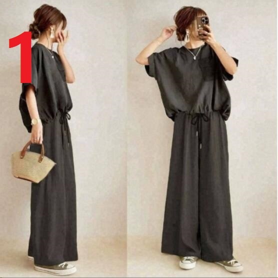 - 秋のセットアップ 黒グレーのTOPSと薄いグレーのワイドパンツの2点セット 新品 大きいサイズLサイズ柄選択可