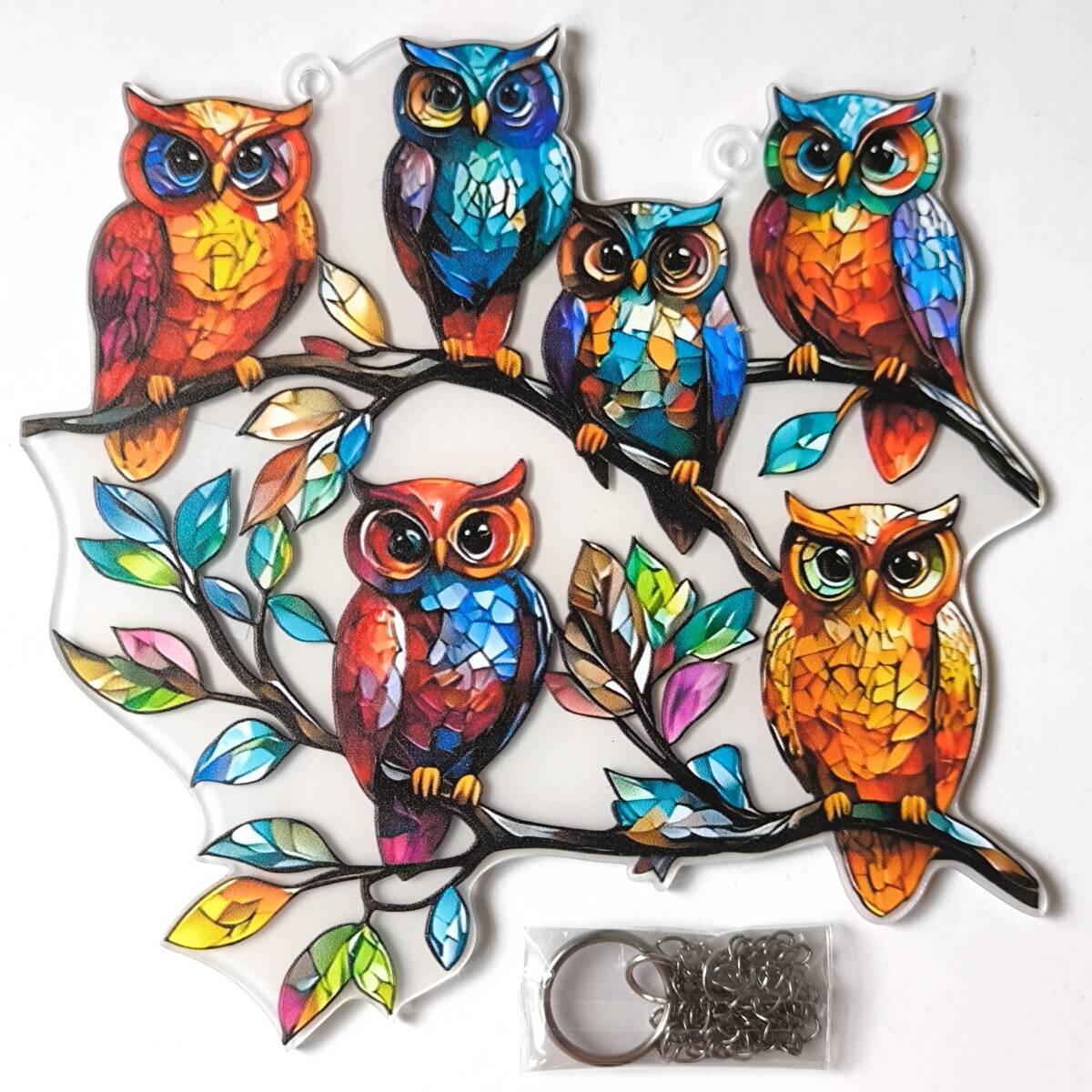 - 【6羽のフクロウ】アクリルプレート 飾り サンキャッチャー チェーン付き オブジェ お洒落 壁や窓辺の飾りに◎
