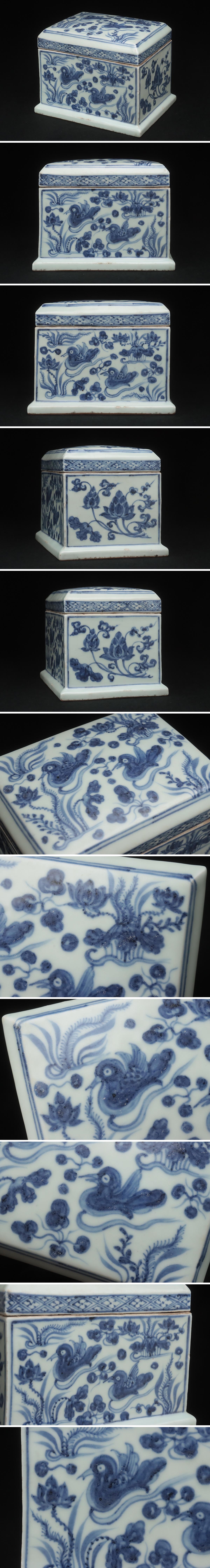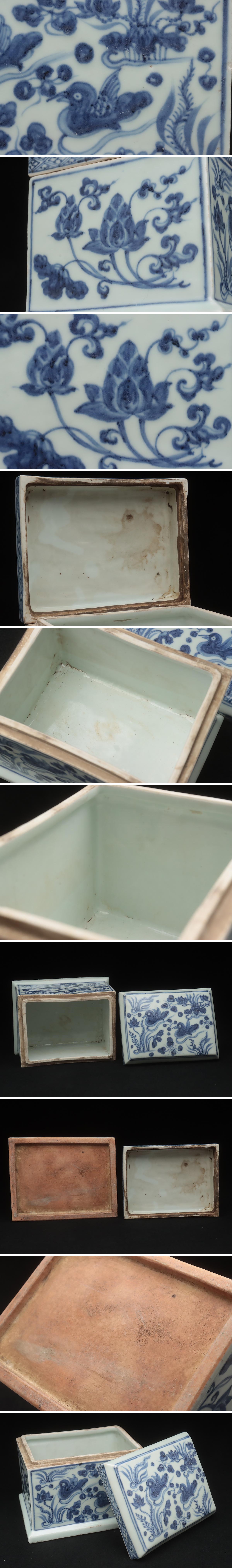 - ZN102 中国美術 染付蓮池鴛鴦図蓋物 幅16.5cm・青花蓮鴛鴦圖長方盖盒 中国古陶磁 中国古玩 古美術 清時代