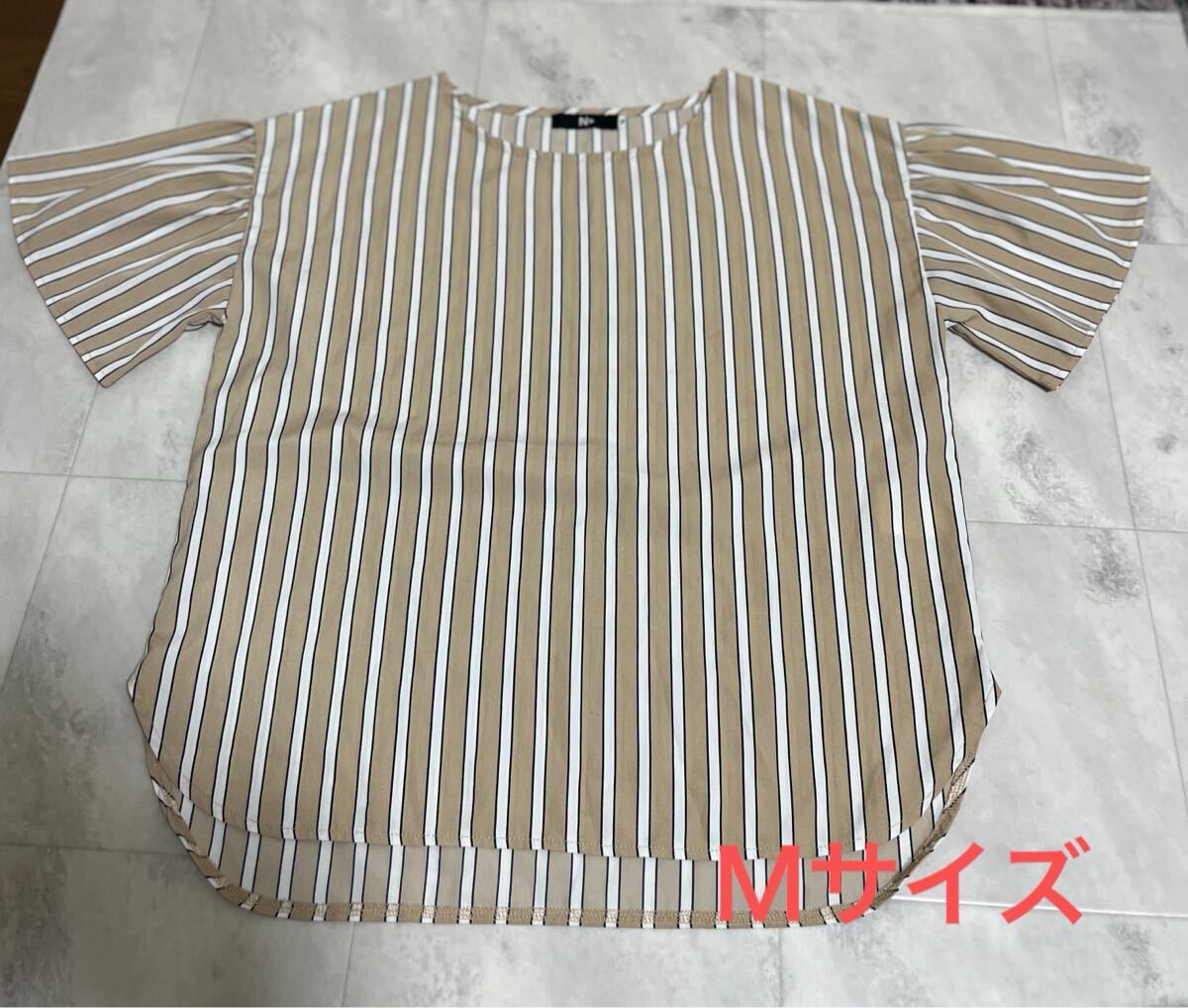 - N+ エヌプラス 袖フリル カットソー ストライプ Mサイズ ベージュ系