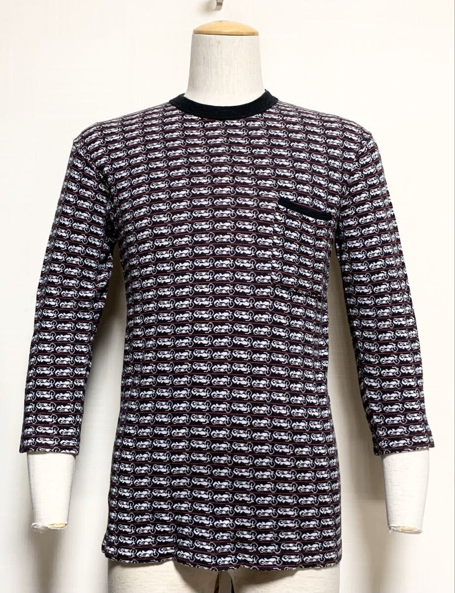 > 極上:ウエストライド.7分袖 ヘビーウェイト コットン ニット カットソー S(34-36/バイク柄/バイカー/肩45幅48丈68/デニム/skull flight)