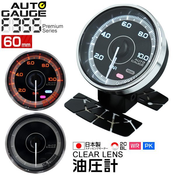 > 日本製モーター仕様 新オートゲージ 油圧計 60mm 追加メーター クリアレンズ ワーニング ピーク機能 オイル 計器 白/赤点灯 F355