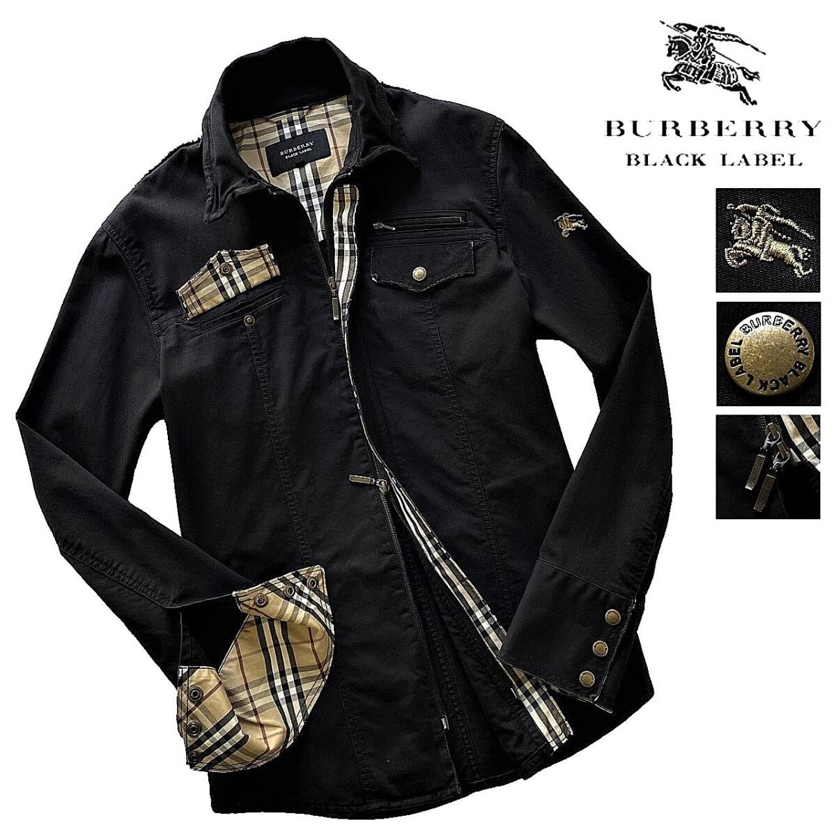 > 極美品 バーバリーブラックレーベル BIGホース刺繍 ノバチェック 加工 襟ワイヤー ミリタリー シャツジャケット M 黒 BURBERRY BLACK LABEL