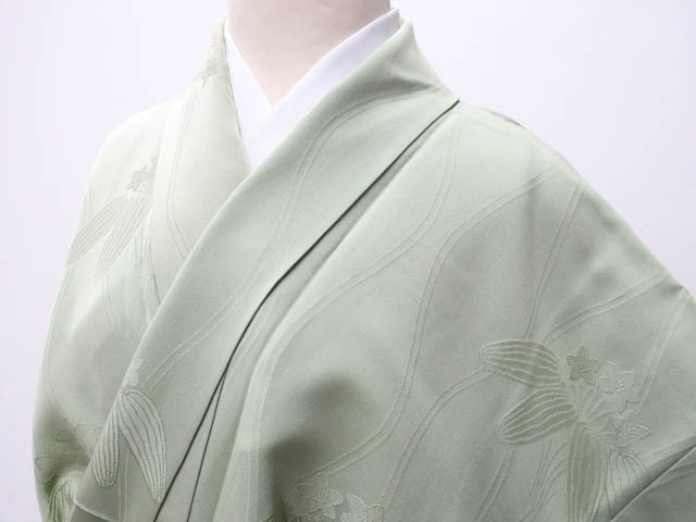 > 《京都一輝堂》【着物】 色無地 一つ紋 立涌に植物文 身丈約156.5cm 身丈約63.5cm 24z-2988