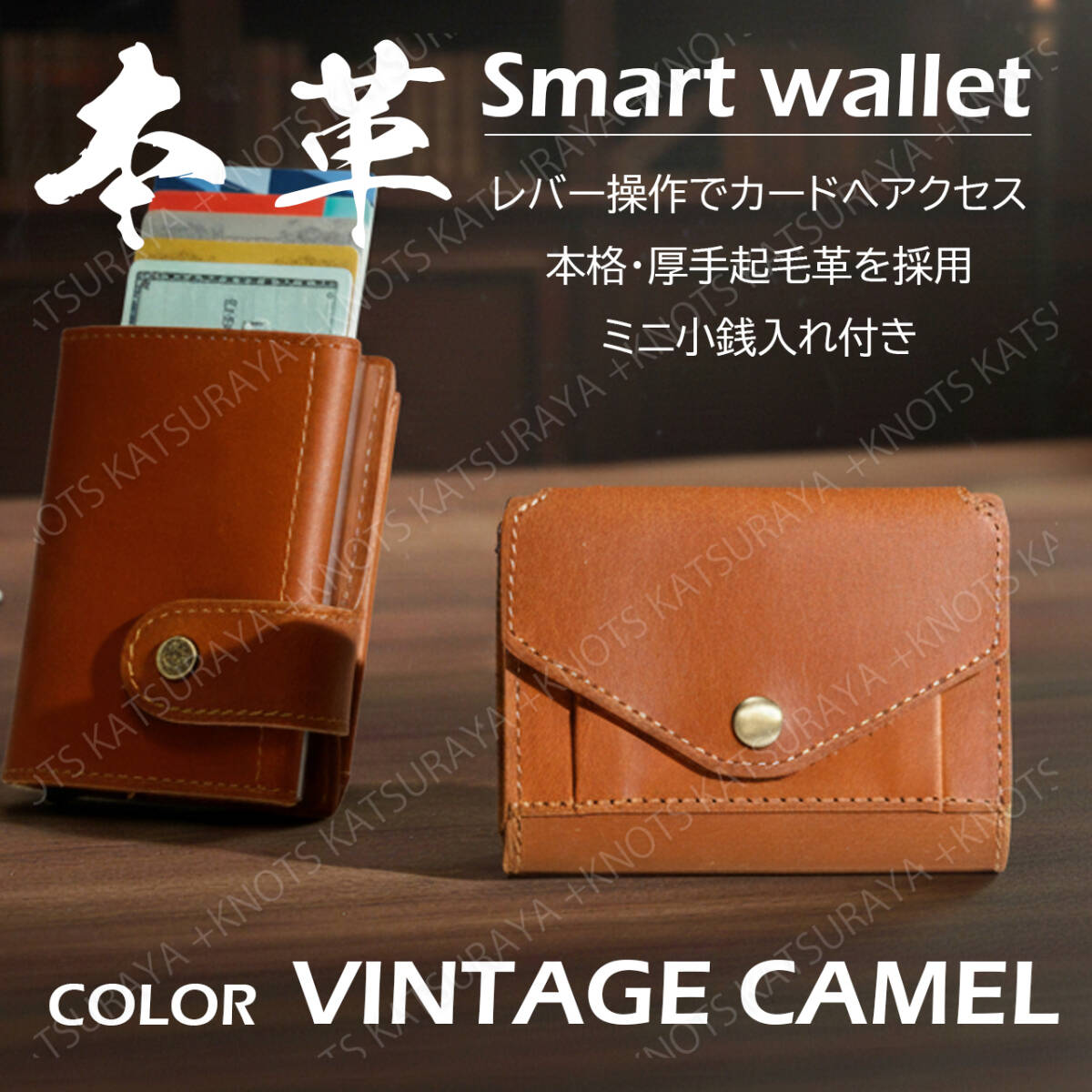 - 本革 スマートウォレット★キャメル★メンズ 三つ折り財布 ミニ財布 小さい 小さめ 小型 牛革 レザー スライド式 カード飛び出すa313