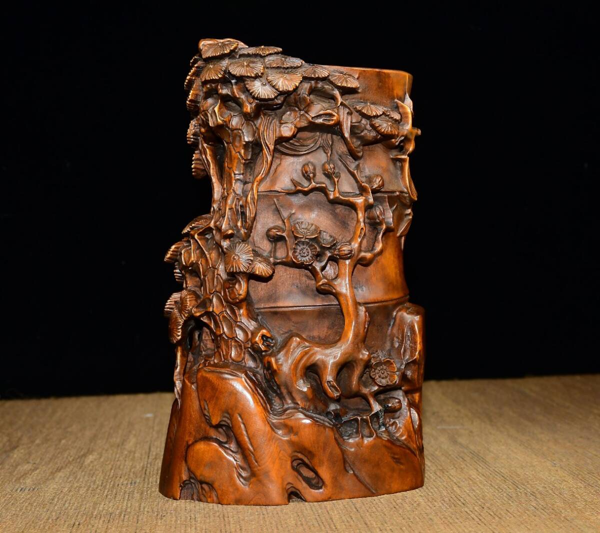 - 旧 清代 小葉黄楊木 歳月三寒 筆立て置物 中国古美術 古賞物 古置物 唐物 S710