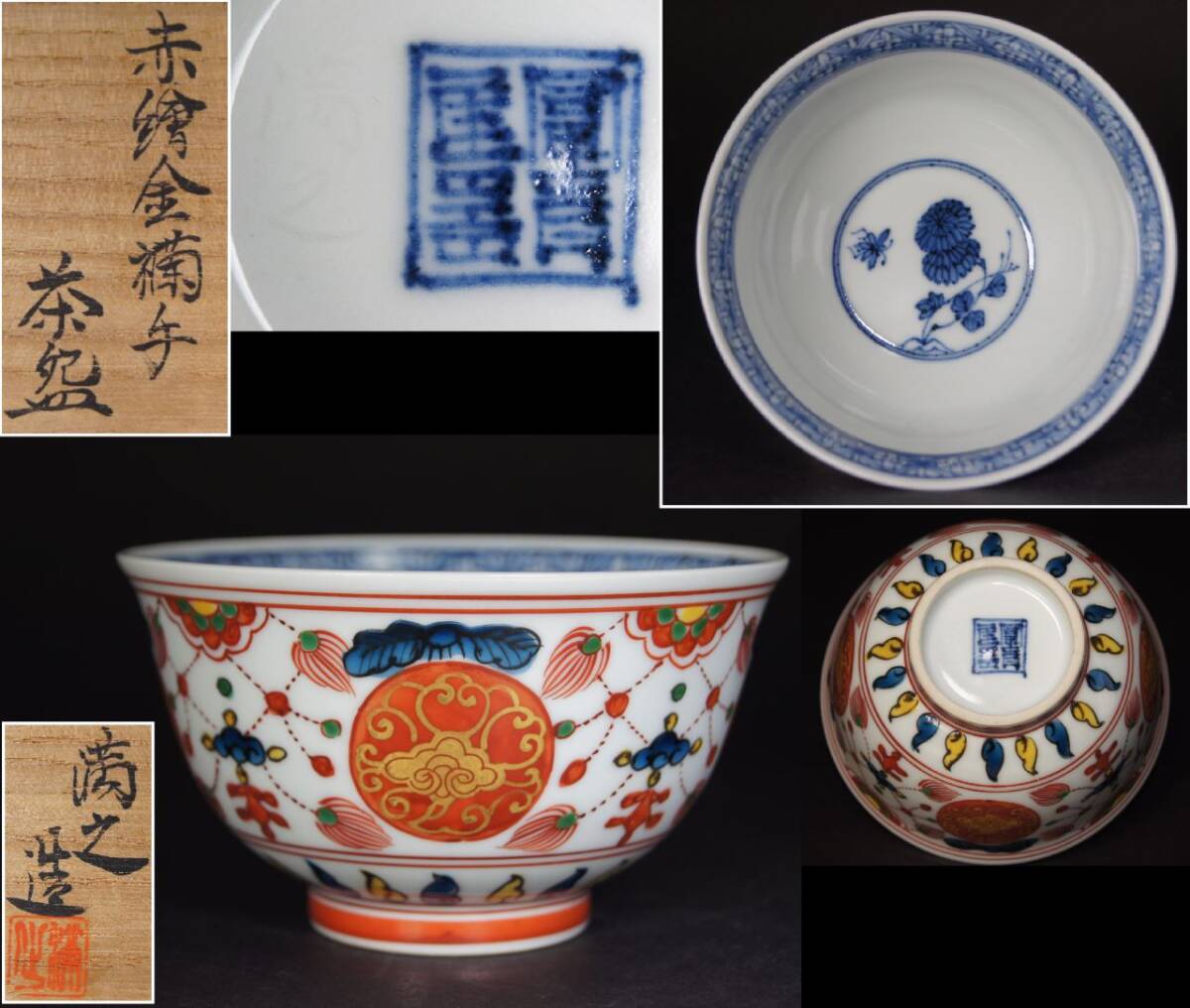 > 中国明写し■川瀬満之 造■ 赤絵金襴手 茶碗 見込に染付花蝶図 共箱・共布・栞付 色絵 青花 青華 抹茶碗 抹茶茶碗 茶道具 茶器 真贋保証