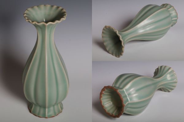 - N26138 中国陶器 青磁瓜瓶花口瓶 花入 花瓶 茶道具 華道具 検:青磁 青瓷 官窯 中国 古玩 唐物