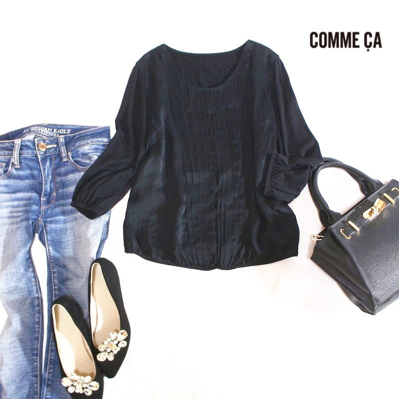 - コムサ COMME CA 大人 綺麗め 秋 合物 薄手 ウール混合 艶サテンフリル 8分袖 ニットカットソー 小さいサイズ 5号 ブラック 黒 ブラウス