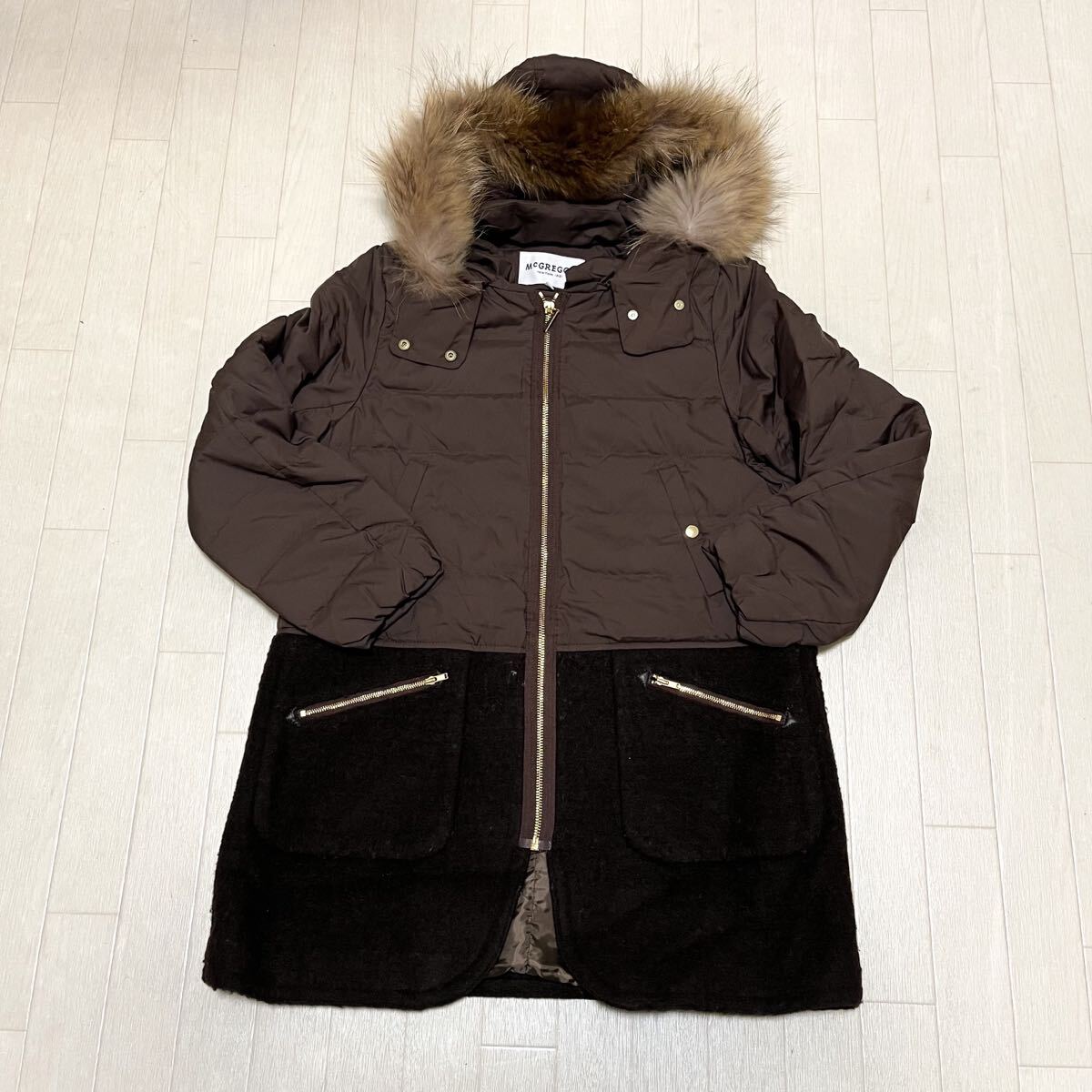 > 和852★ McGregor マックレガー ダウンコート 切替 セミロングコート フード ジップアップ M ブラウン レディース