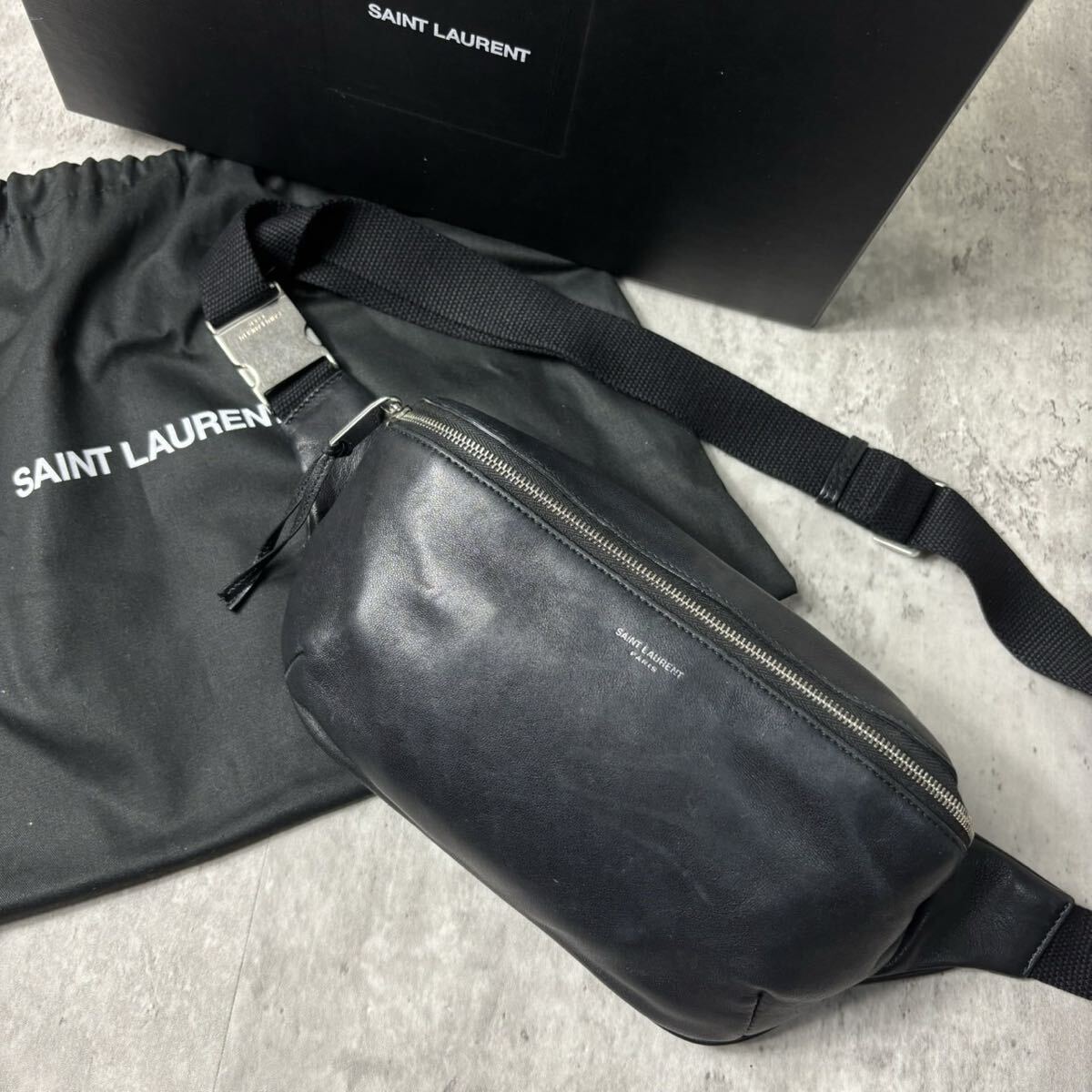 - 極美品/箱付き●SAINT LAURENT サンローラン ボディバッグ ウエストバッグ クロスボディ 斜め掛け ビジネス レザー 本革 メンズ ブラック