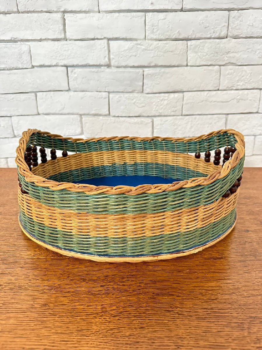 ライトブラウンカラーとグリーンカラー、ブラウンカラーのウッドビーズで仕上げられた、カラフルなカゴです。
