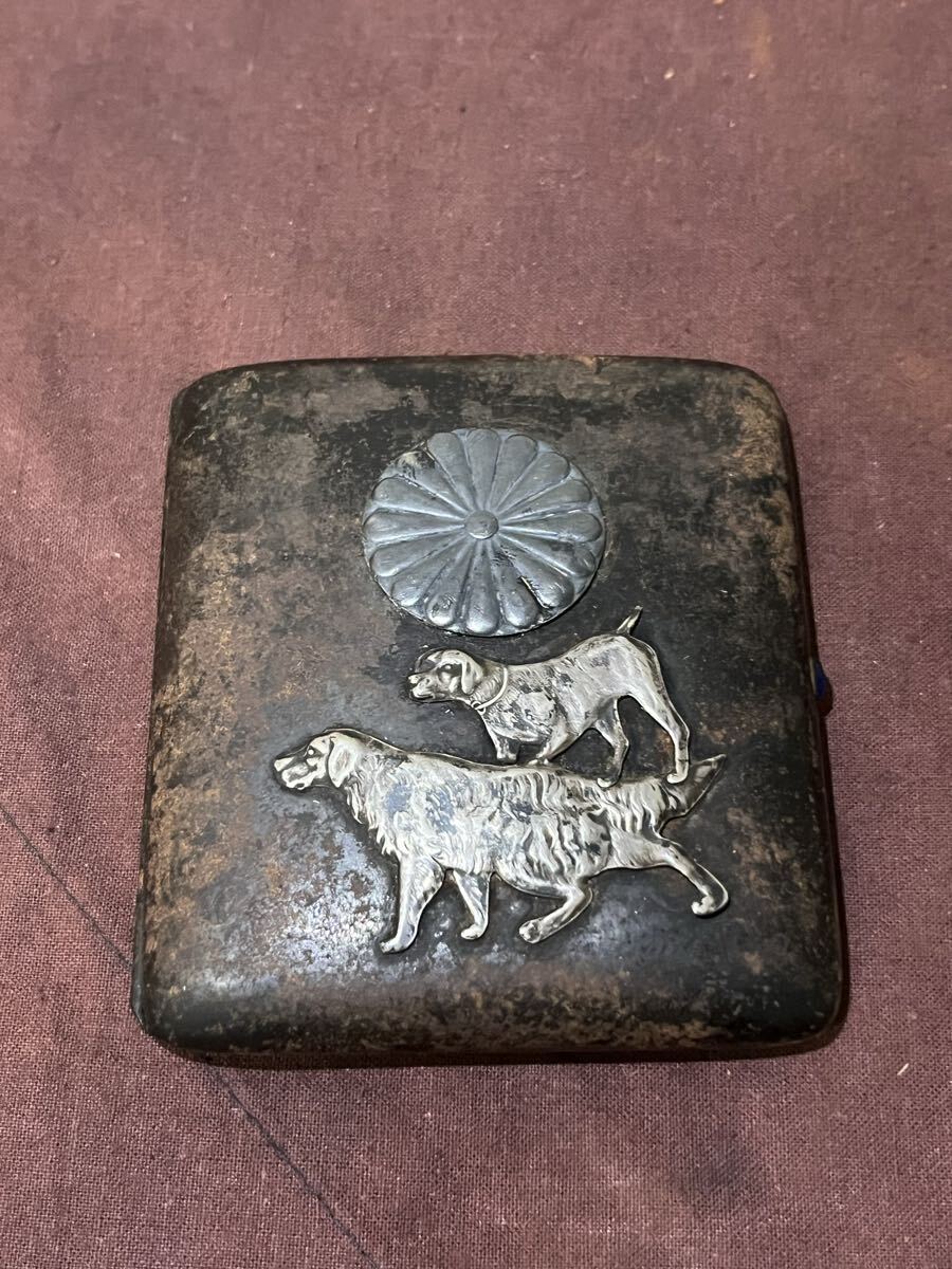 - 宮家拝領品 鉄製菊紋入犬象嵌煙草ケース シガレットケース 喫煙具 レトロ 煙草入れ アンティーク コレクション