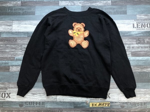 - レディース ビッグテディベアプリント 裏起毛 プルオーバー トレーナー 黒