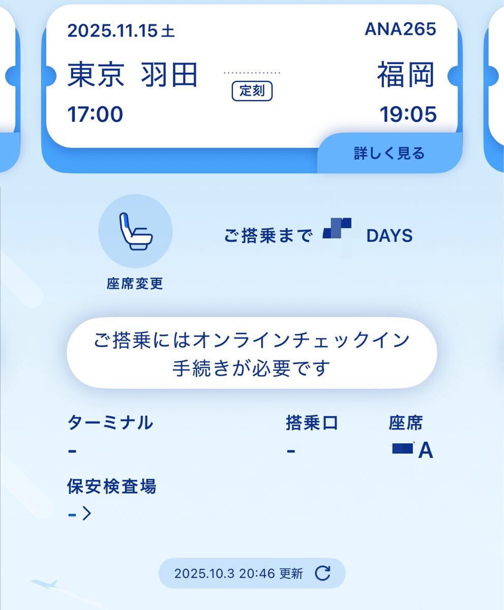 - ANA11/15(土)17:00羽田発福岡行き