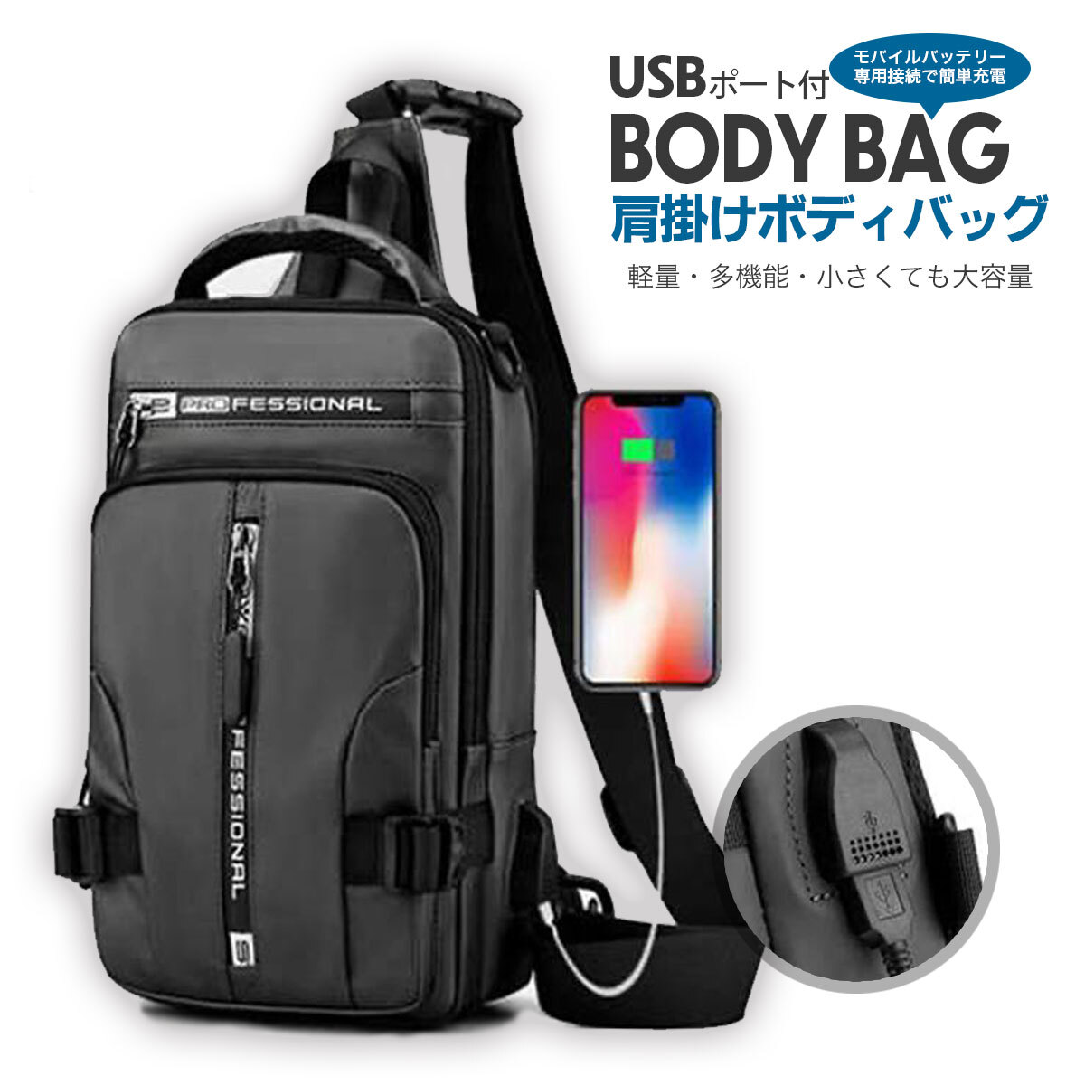 - ボディバッグ USBポート付 多機能 大容量 軽量 4WAYショルダー リュックサック 斜め掛け 男女兼用 iPad対応 スマホ収納