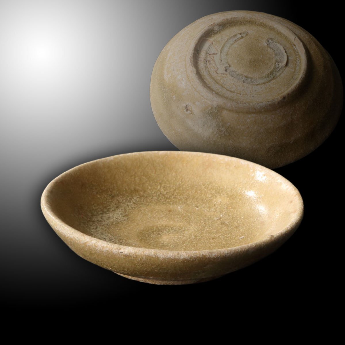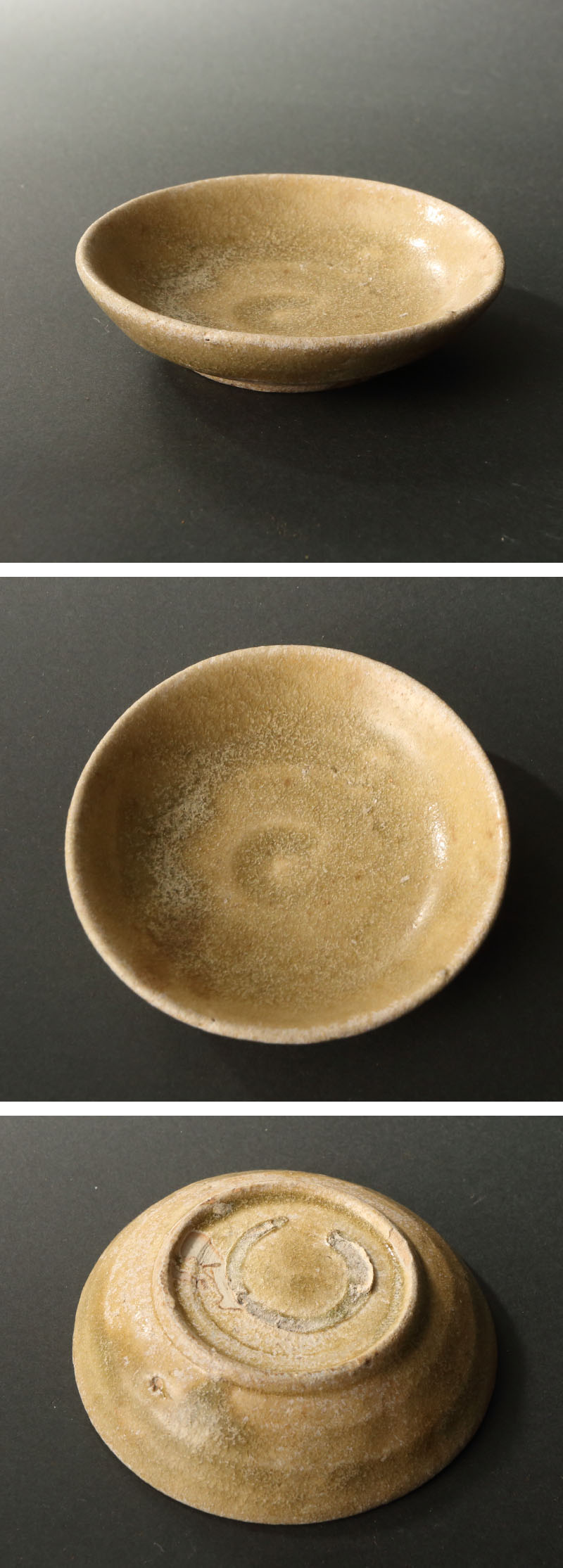 - 【深和】桃山期◆黄瀬戸平盃(桃山古陶 美濃焼 古瀬戸 灰釉 石盃 酒器 ぐい呑 豆皿 懐石具 抜けタンパン)