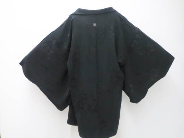 - 《古美術京松》【着物】アンティーク 黒羽織 縫い紋 地紋入り 羽織紐付き 身丈約82.5cm 裄丈約63.5cm kyo7z05-297