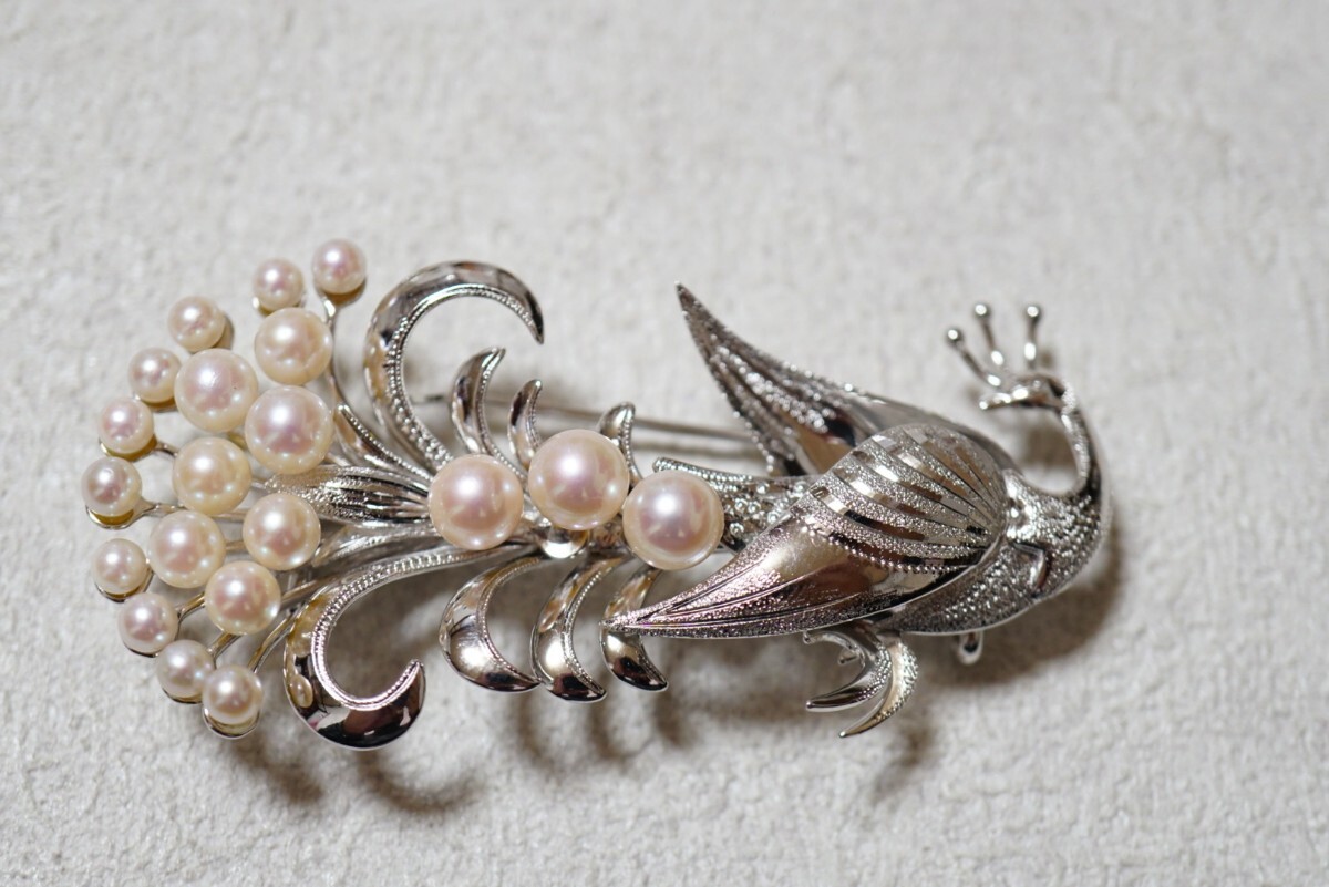 > 485 和装小物 アコヤ真珠 本真珠 パール アニマル 孔雀 ブローチ 帯留め ヴィンテージ アクセサリー SILVER刻印 冠婚葬祭 あこや 2way