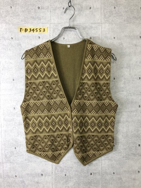 - レディース 日本製 エスニック柄 リネンMIX ニット ジレ M 茶カーキベージュ