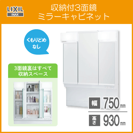 > ミラーキャビネット3面鏡 収納付き LIXIL INAX 幅:75cm 高さ:93cm MPV1-753TYJ