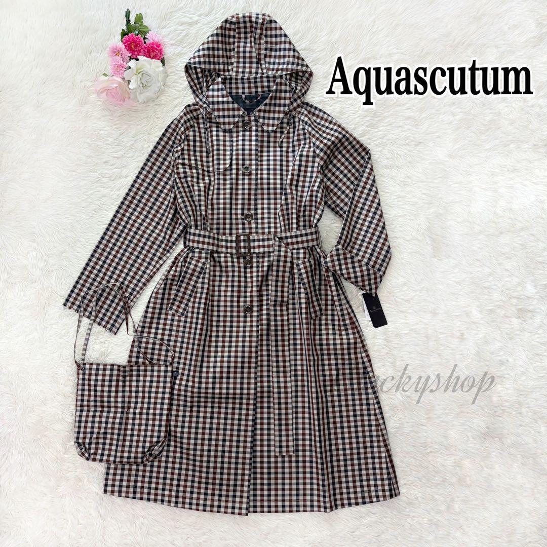 > Aquascutum アクアスキュータム トレンチコート レイン コート タグ付き 未使用 クラブ チェック L ベルト フード 収納袋 レインウェア