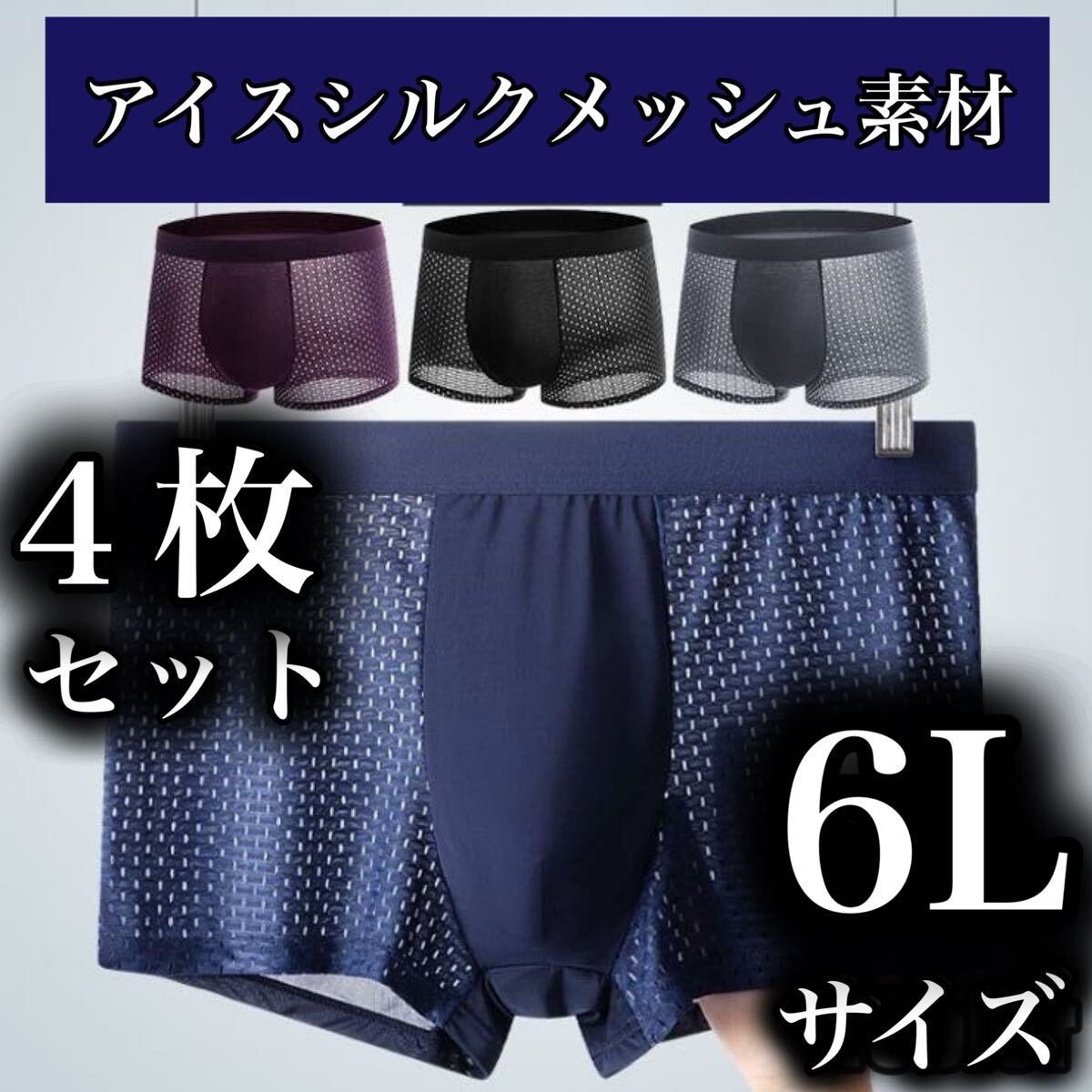 - メッシュ メンズ ボクサーパンツ 6L 4枚セット ブラック XXXXXL 男性下着 ブラック ブルー パープル グレー 通気性 5XL アイスシルク