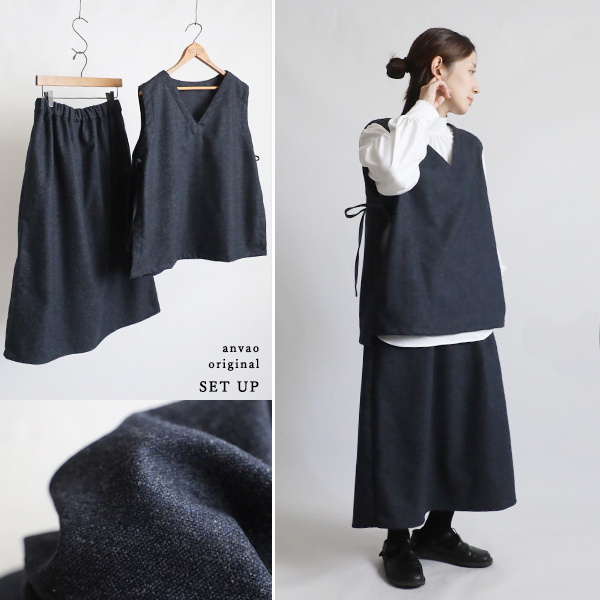 - 秋の新作 暖か縮絨メルトン ウールmix 上下セットアップ サイドリボン付き ベスト スカート ゆったり お洒落 秋冬K20