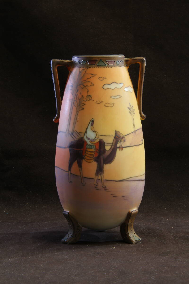 - 3758 オールドノリタケ フラワーベース M-NIPPON 明治 盛上げ技法 縁取り 三つ足ハンドル付き 中東 ラクダ ヤシ
