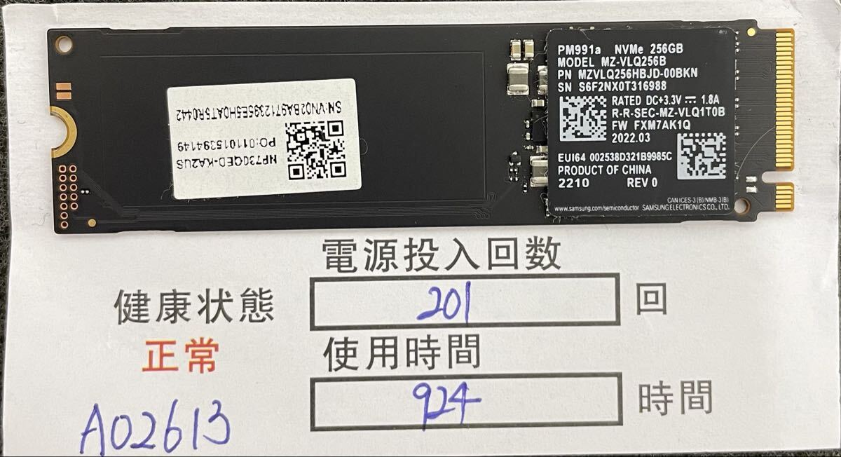 - A02613/ 中古品/M.2 NVME 2280 SSD/Samsung /256GB/動作確認済み/返品返金対応/納品書発行可(商品説明文ご確認下さい)