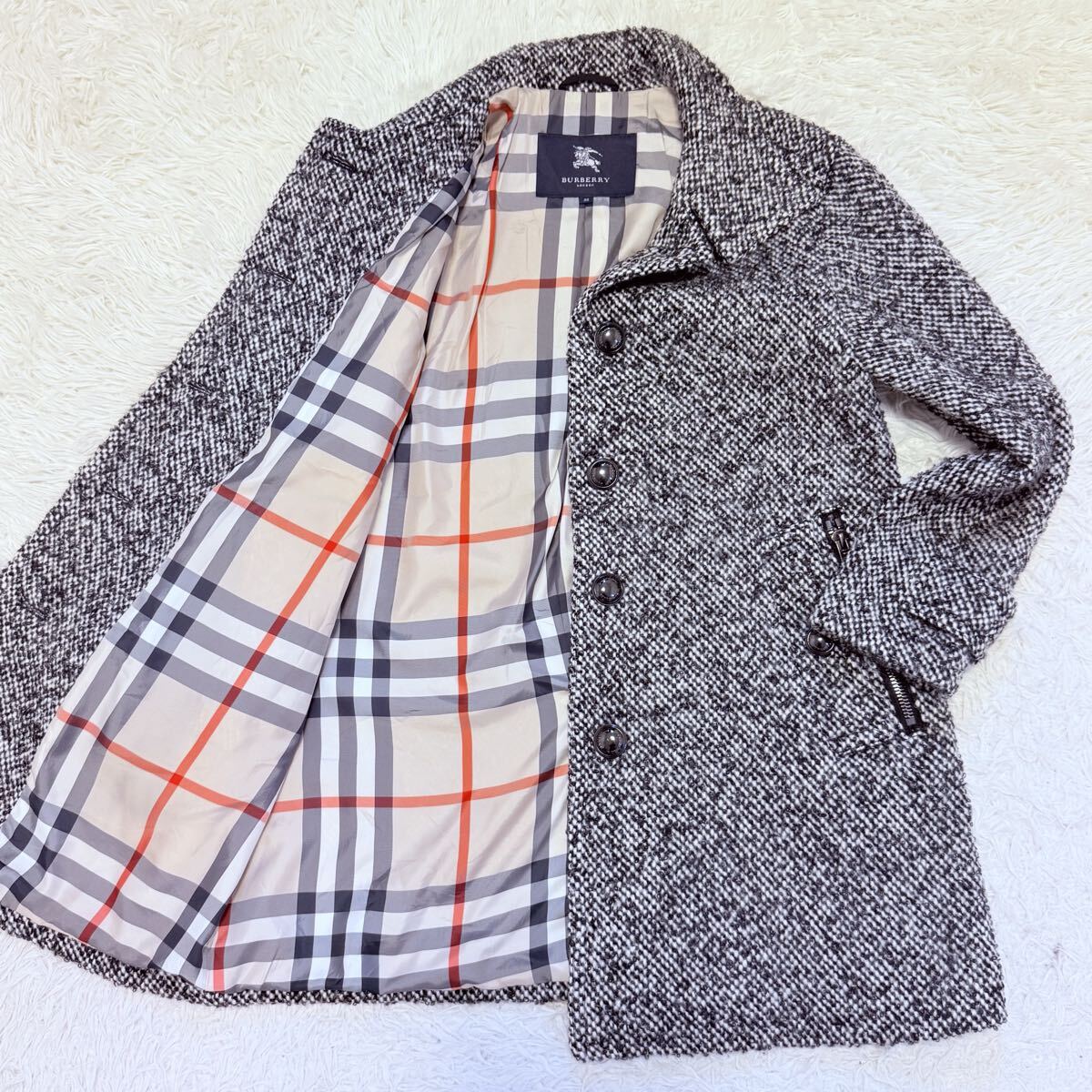 > 【美品】BURBERRY LONDON ツイード ウール ステンカラーコート ノバチェック メガチェック レディース グレー Mサイズ