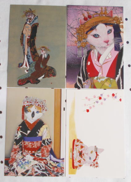 - 4枚!オッドアイ美猫ポストカードB☆新品/和風/日本画/浮世絵☆CAT/白ネコ/トラねこ/金目銀目/着物/ハガキ