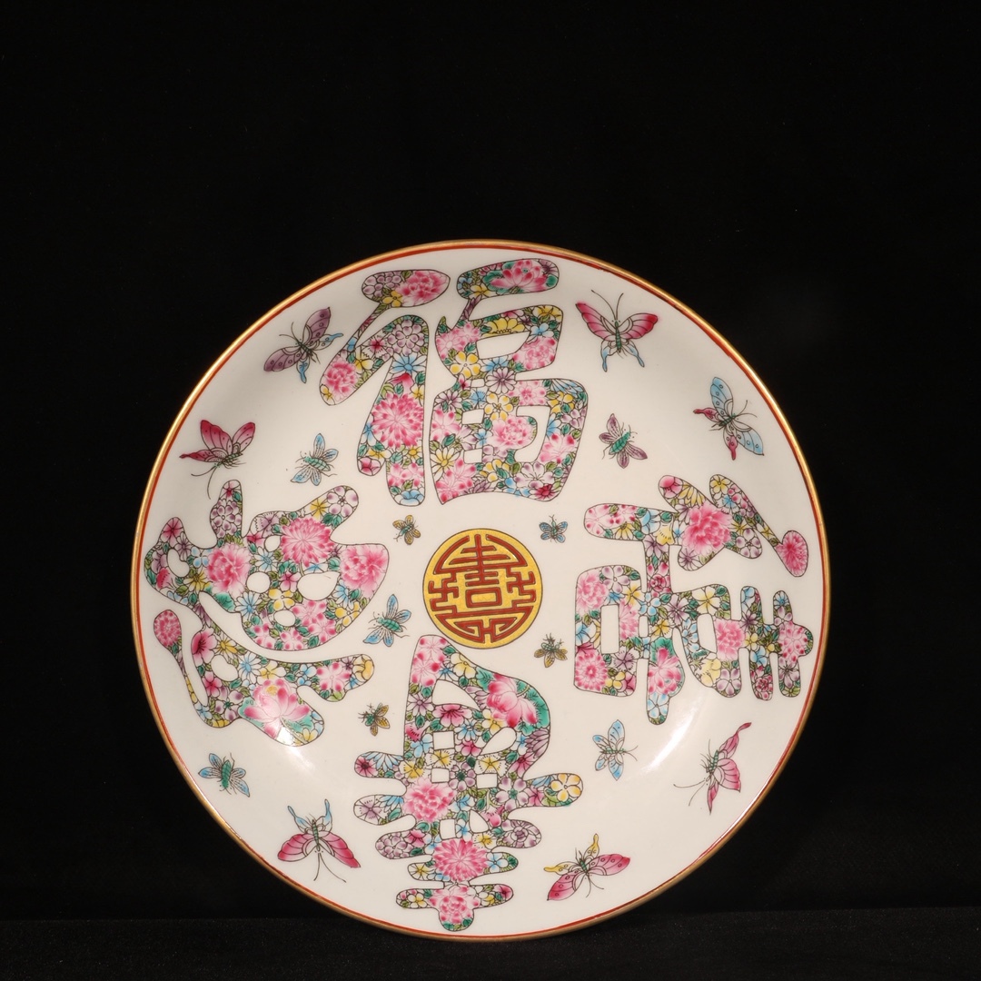- 清時代 雍正 粉彩 描金 万花福禄寿禧文盤 唐物 箱付き 陶磁器 中国美術 古美術 置物 骨董品 高さ4cm 直径21cm RG1209