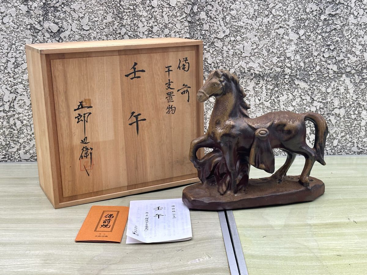 > 【うぶだし品】五郎辺衛窯造 備前焼 干支置物 壬午 題名 躍進する竜馬 在銘 陶印 共箱 インテリア/オブジェ/縁起物/骨董/美術品/茶道具 :YU