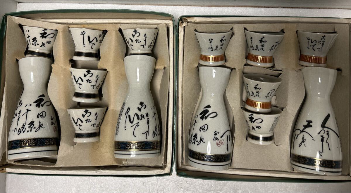 > アンティーク/九谷焼の酒器セット×二箱/お銚子合計4本、お猪口合計10個/赤又は黒/九谷焼き/酒器/陶器/徳利/裏に銘あり/G027