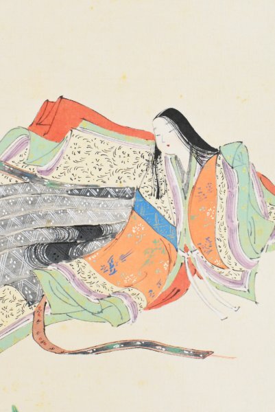 - K6387 模写 佳数都久「十二単美人図」絹本 合箱 美人画 稚松 絵画 中国 日本画 茶掛 掛軸 掛け軸 古美術 人が書いたもの