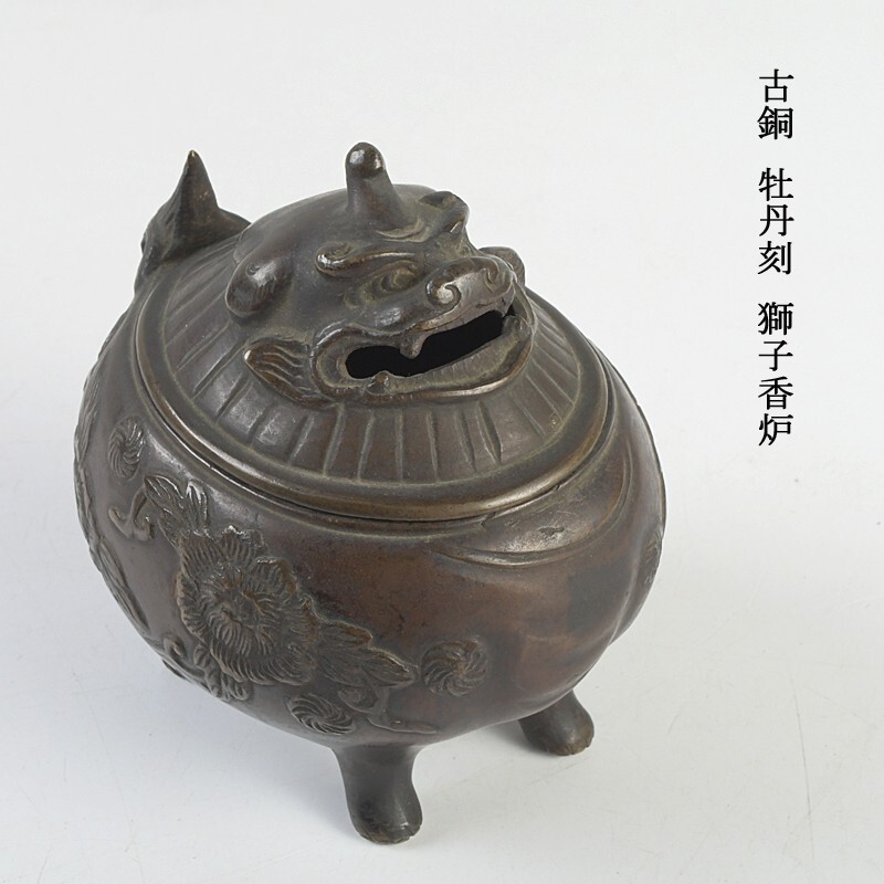 - 中国美術 古銅 牡丹刻 獅子香炉 古玩 ILOT