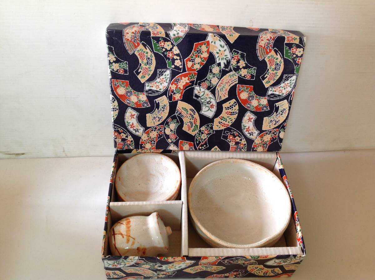 - *志野焼 美濃 焼乳白色 陶器 陶芸 削りや、絵など 食器セット 油差し1個蓋あり、小皿5個、小鉢1個 箱附 中古品*