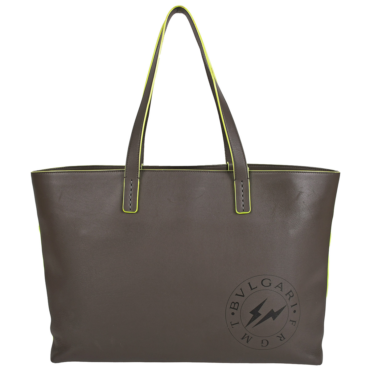 > ブルガリ BVLGARI フラグメント FRAGMT トートバッグ 藤原ヒロシ ショルダー 肩掛け レザー グレー ネオンイエロー ロゴプリント 中古