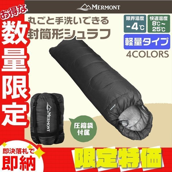 > 【限定セール】封筒型シュラフ 洗える寝袋 耐寒温度-4℃ 軽量1.3kg 圧縮袋 連結可能 登山 キャンプ アウトドア 車中泊 防災 mermont 黒