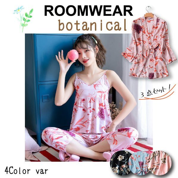 - ルームウェア レディース 3点 パジャマ キャミソール 秋 冬 長袖 ショートガウン 寝巻 可愛い 花柄 部屋着 ボタニカル 上下セット