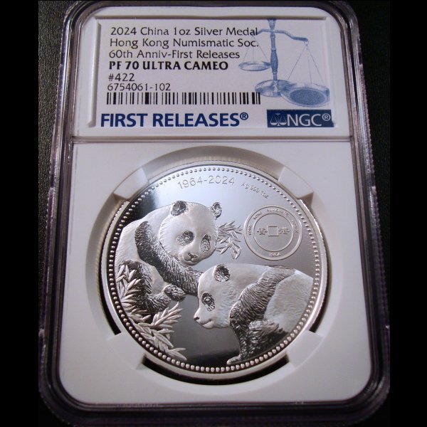 - ●中国 2024年 NGC PF70UC FirstReleases パンダ銀貨 / 香港貨幣研究会60周年記念 / プルーフ / 金メッキ GILT / 発行520枚