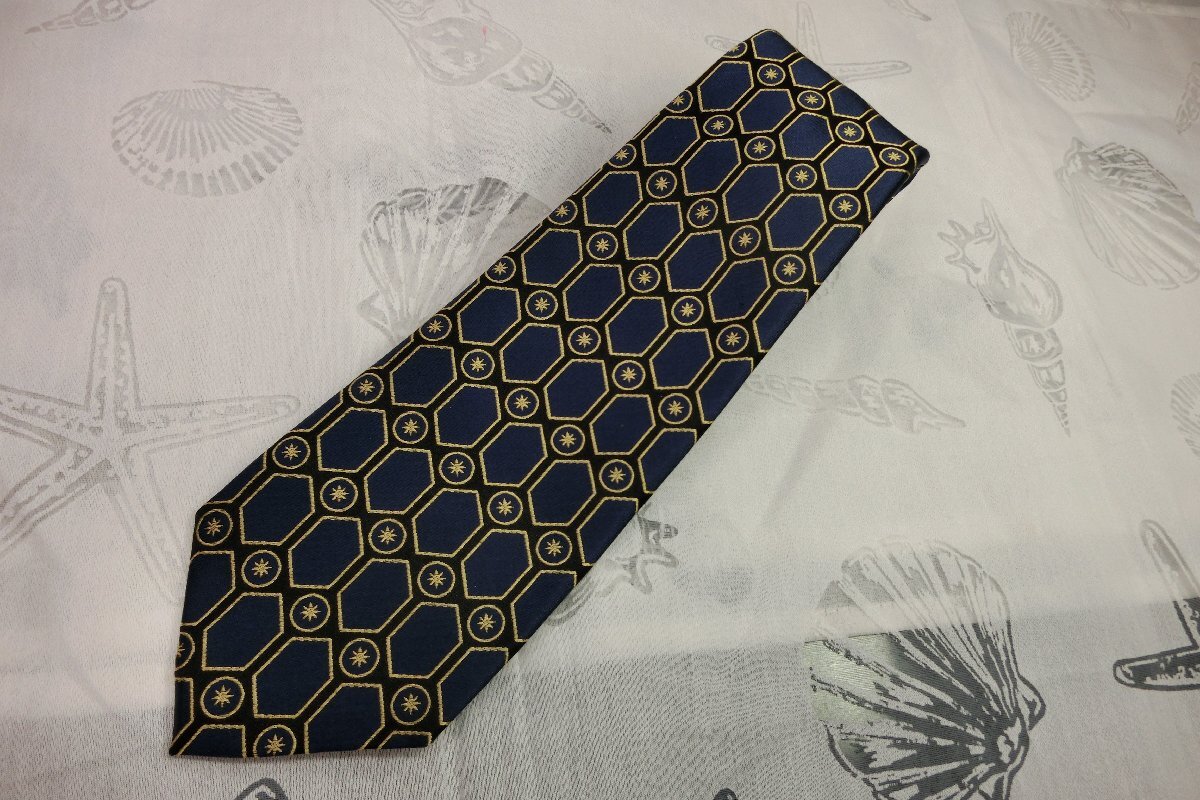 > ♪美品 イタリー製(正規品)★BVLGARI/ブルガリ★ネイビー・ゴールド総柄ヘキサゴン・丸小紋柄セタシルクネクタイ Handmade in Italy