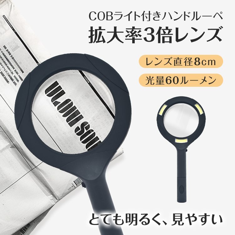 - 送料無料 拡大鏡 ルーペ ハンドルーペ 虫眼鏡 読書ルーペ 3倍拡大 LEDライト付き COBライト付き レンズ8cm 乾電池式 60ルーメン rt021