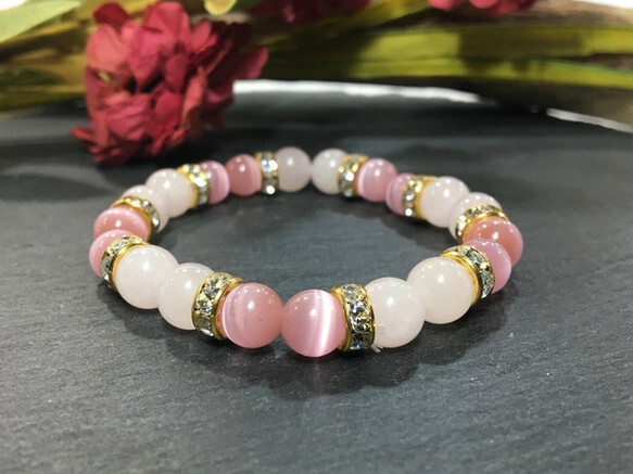 > ローズクォーツ&キャッツアイ(ピンク) パワーストーン ブレスレット(ゴールド)レディース 女性 開運 数珠 プレゼント