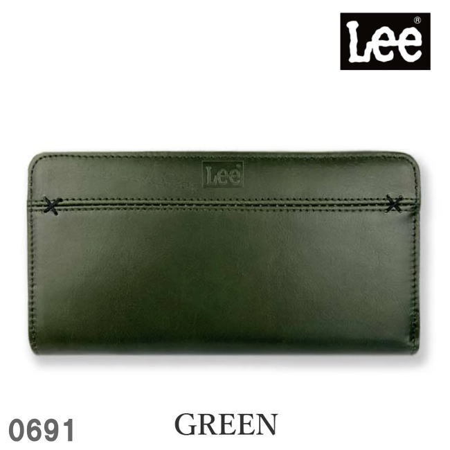 - グリーン Lee リー クロスステッチ ラウンド 長財布 リアルレザー0691