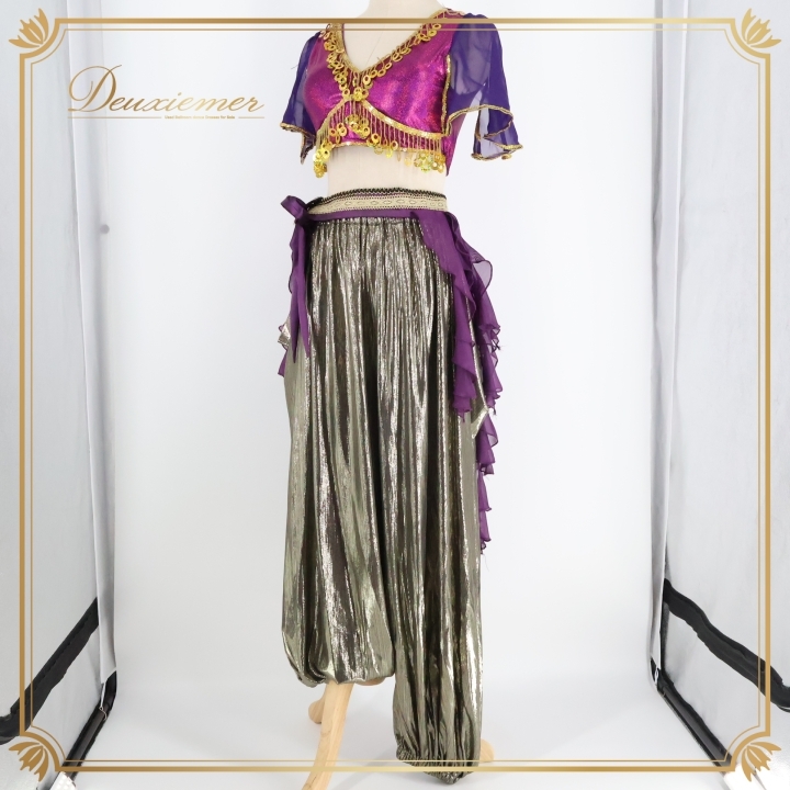 - ベリーダンス アラジン 衣装 上下セット レディース パープル系 紫 ゴールド スパンコールラメ 装飾 レース フリル 舞台 発表会 イベント
