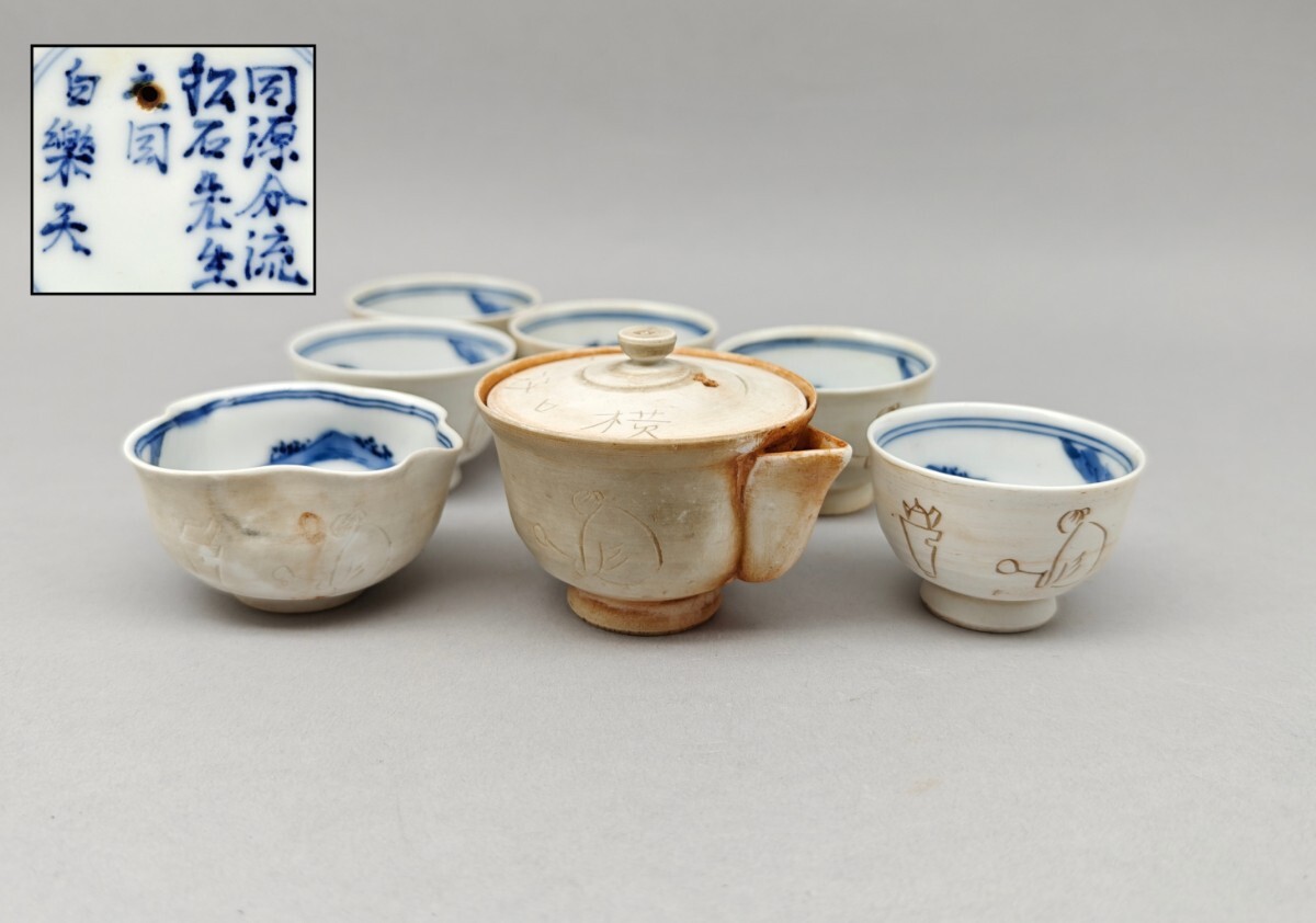 - 【懐】茶器セット 同源分流 松石先生之風 白楽天 宝瓶 湯冷まし 茶盃五客 時代染付 細密手描人物風景図 茶道具 時代物 美術品 AF-054